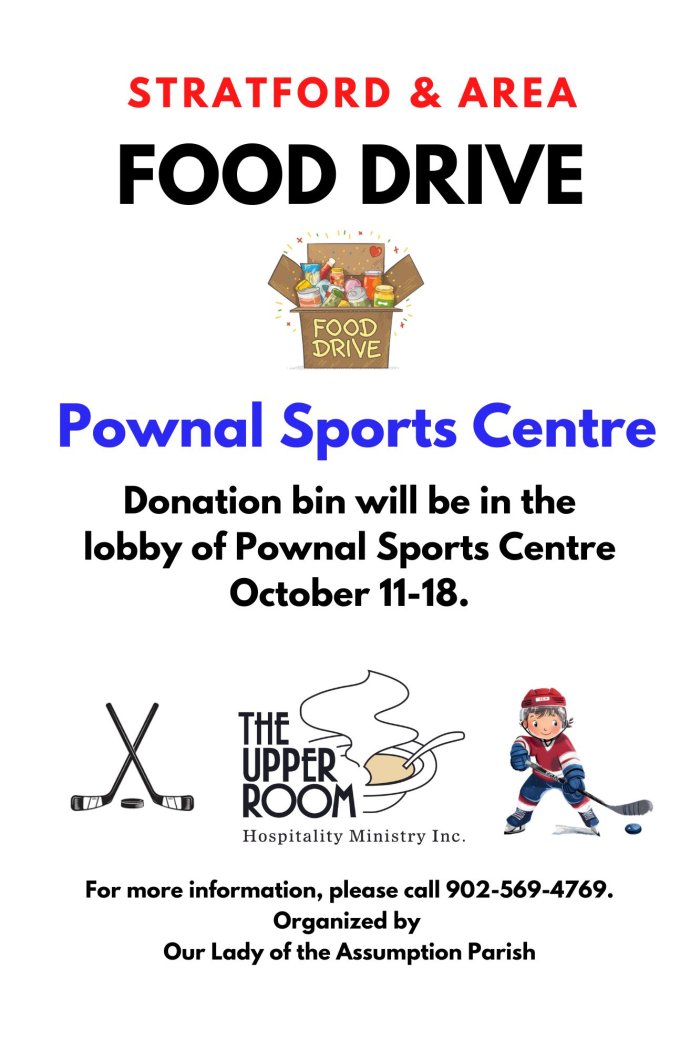 Stratford and Area Food Drive at Pownal Sports CenterPownal Sports Center is participating in the Stratford & Area Food Drive again this year. There will be a donation bin in the lobby from October 11th -18th.